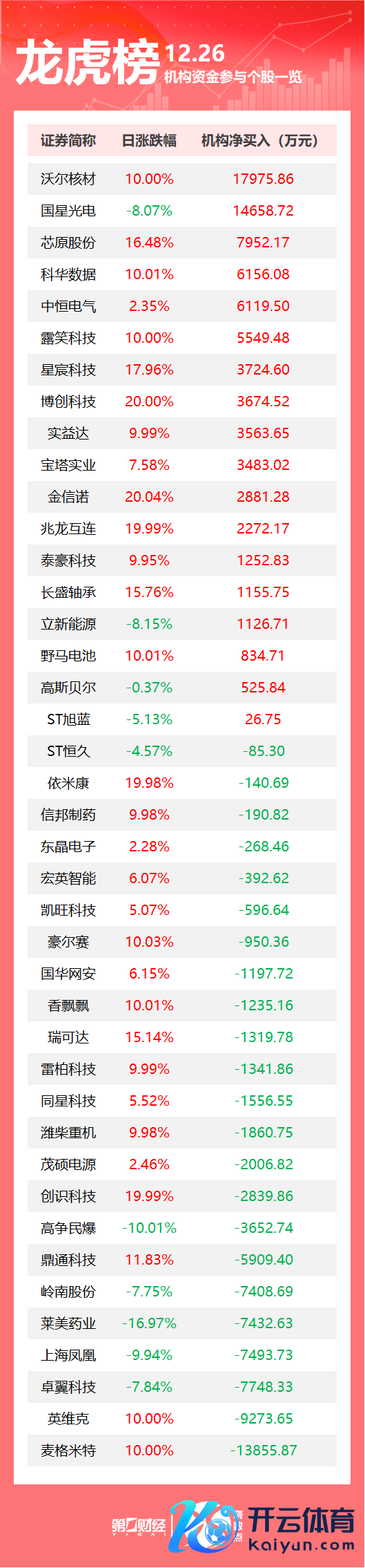盘后数据泄露,12月26日龙虎榜中开yun官网,共41只个股出现了机构的身影,18只股票呈现机构净买入,23只股票呈现机构净卖出。