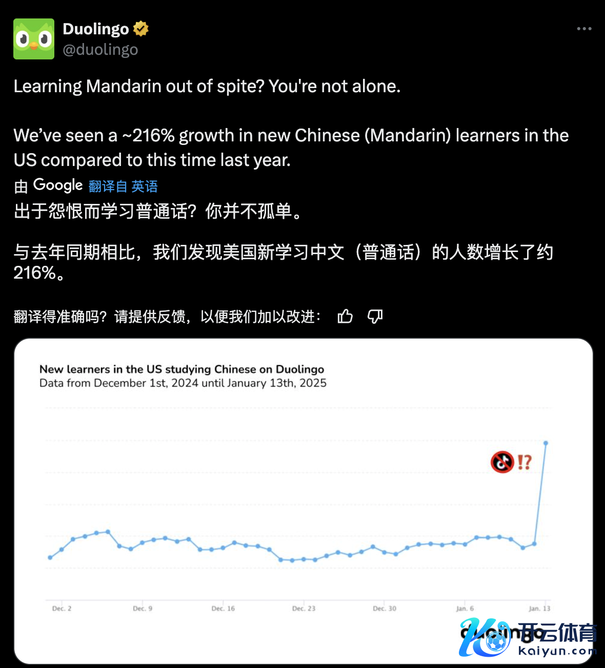 1 月 16 日,多邻国发文示意,相较于客岁兼并时期,学习汉语的好意思国用户量暴涨了 216%。