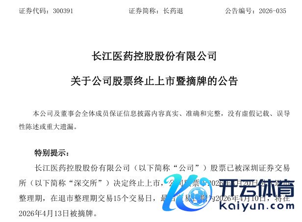 4月12日晚开云半岛官方, 长药退发布公告称,公司股票已被深交所决定拒绝上市, 于3月20日插足退市整理期,临了交游日历为4月10日,将在4月13日被摘牌。